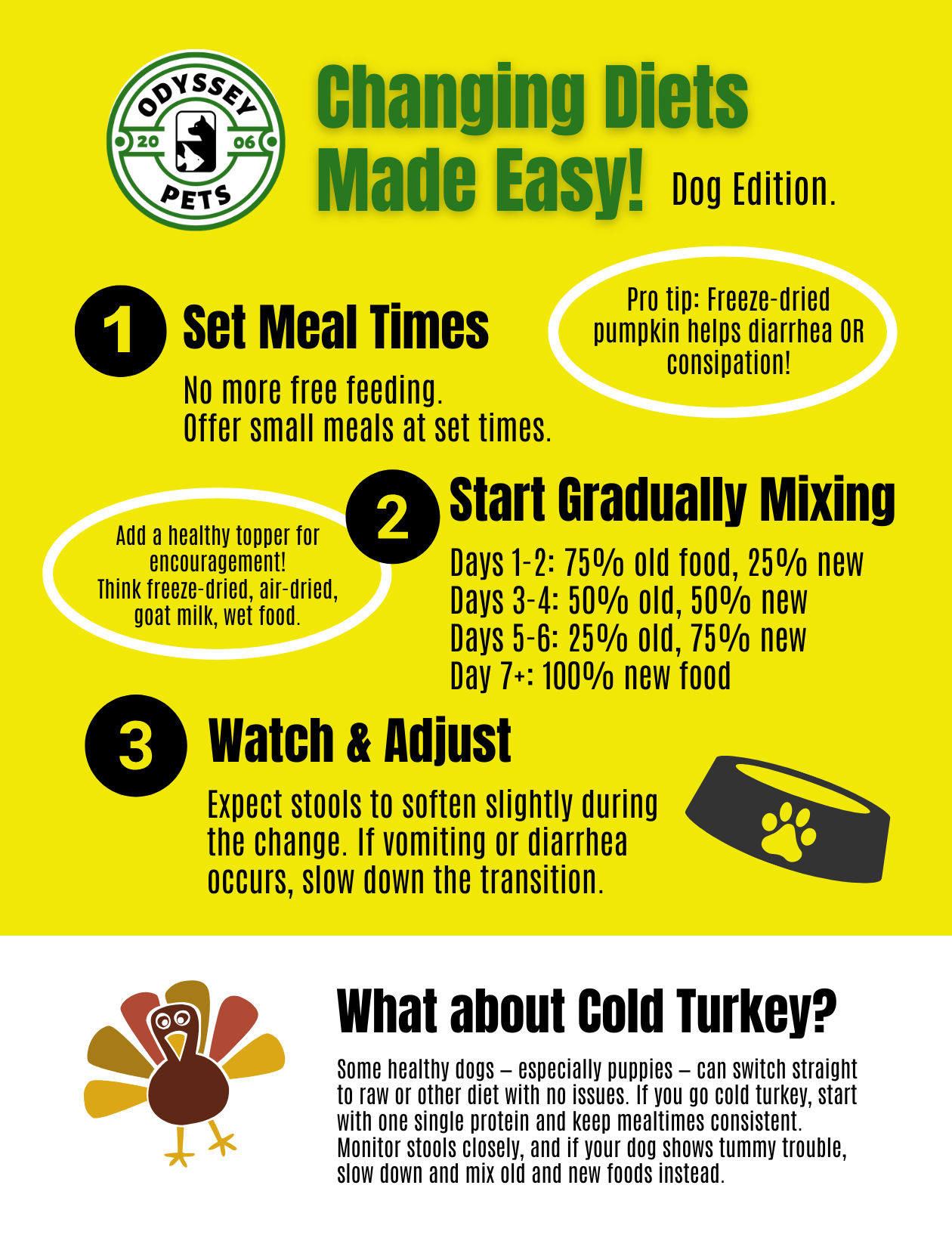 Some dogs — especially puppies — can switch immediately to raw or fresh food without issues. If you go this route, stick to one single protein and consistent mealtimes. Monitor stool quality closely and back up if needed.